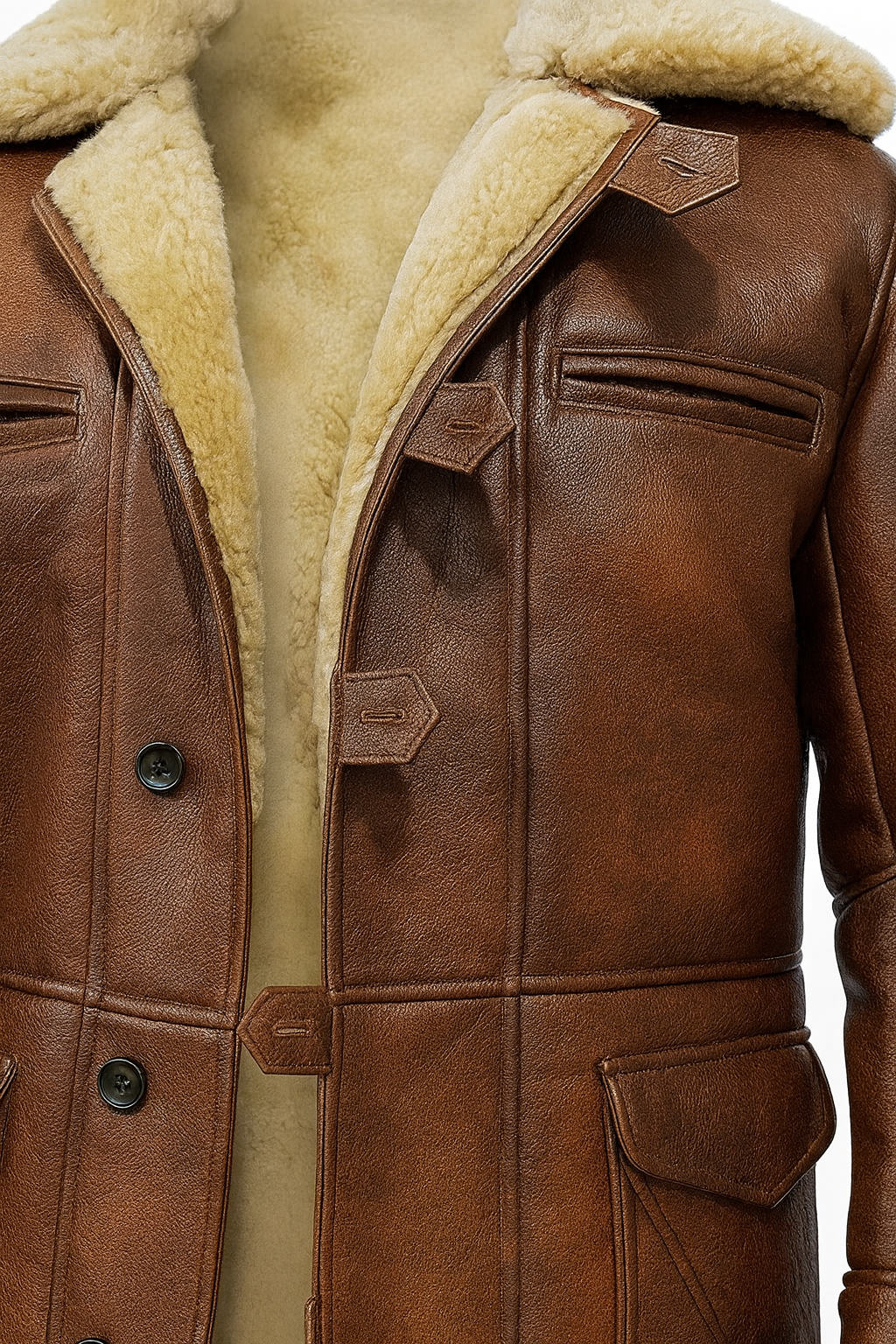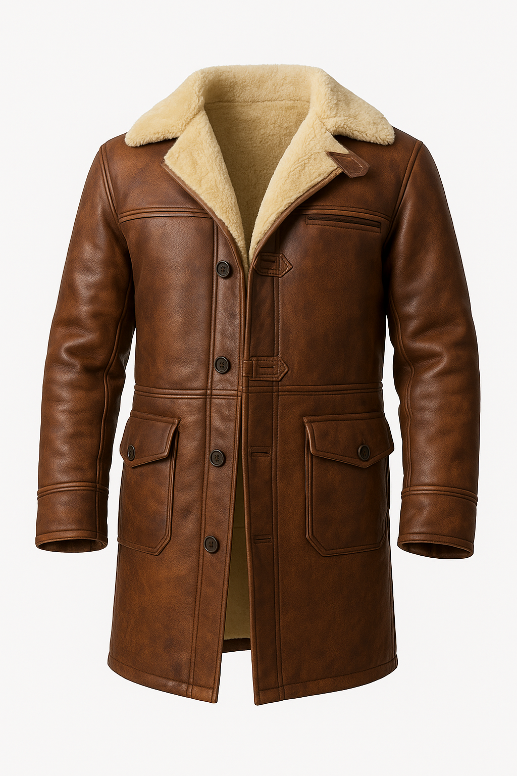 Experience the iconic Bane Shearling Leather Coat inspired by The Dark Knight Rises. Crafted from premium sheepskin leather, this vintage shearling trench coat offers exceptional warmth, durability, and timeless movie-inspired style. Perfect for winter wear, cosplay, or collectors seeking an authentic high-quality leather coat with shearling lining and classic craftsmanship.