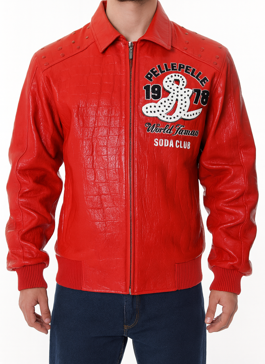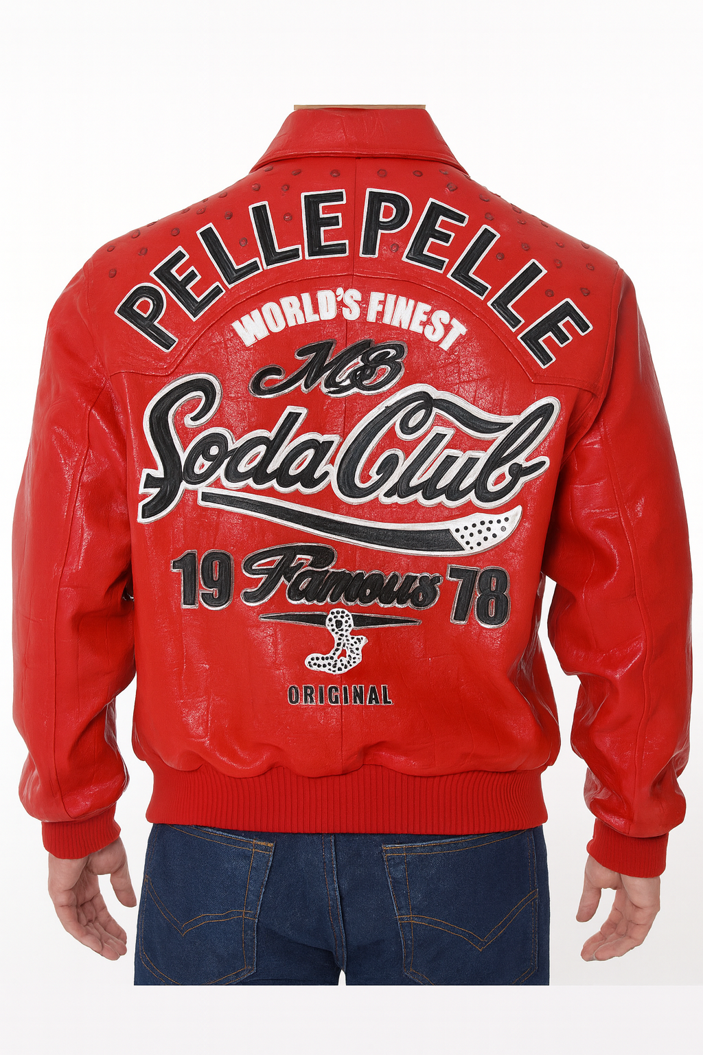 Shop the Pelle Pelle Soda Club Red Leather Jacket featuring premium handcrafted leather, bold Soda Club embroidery, and iconic 1978 streetwear style. This red Pelle Pelle jacket delivers standout hip-hop fashion, vintage detailing, and top-quality craftsmanship perfect for collectors and fans of exclusive Pelle Pelle leather jackets.