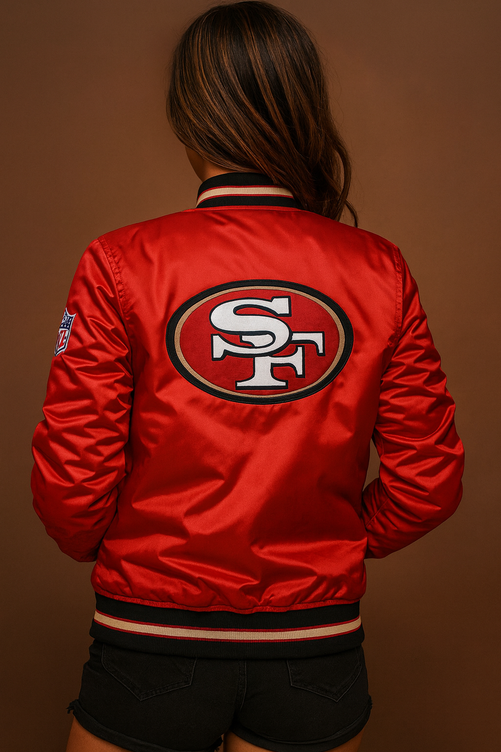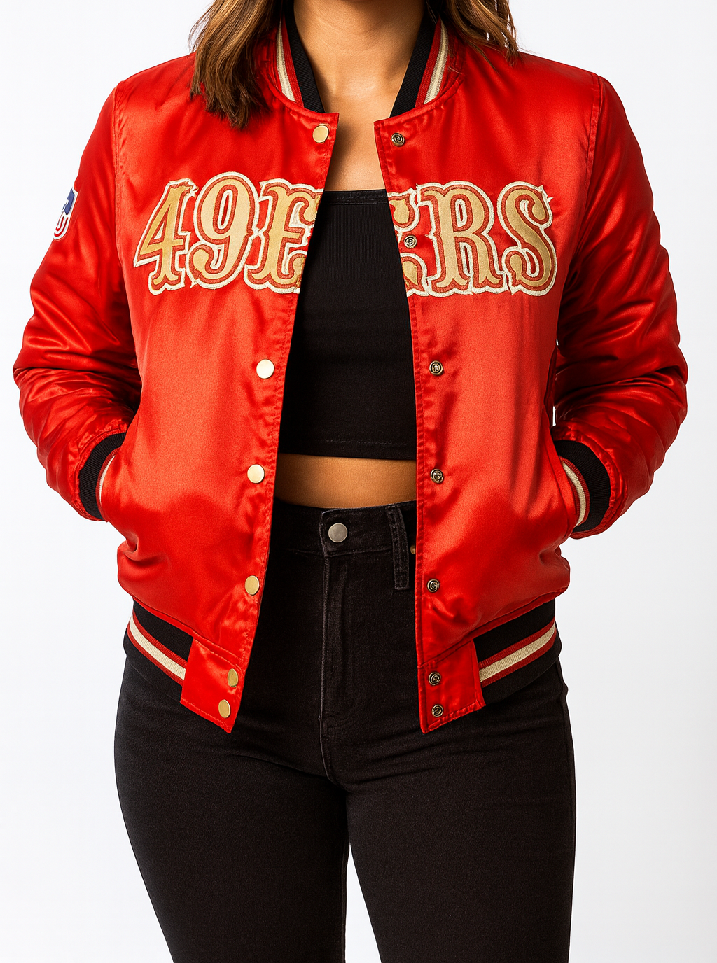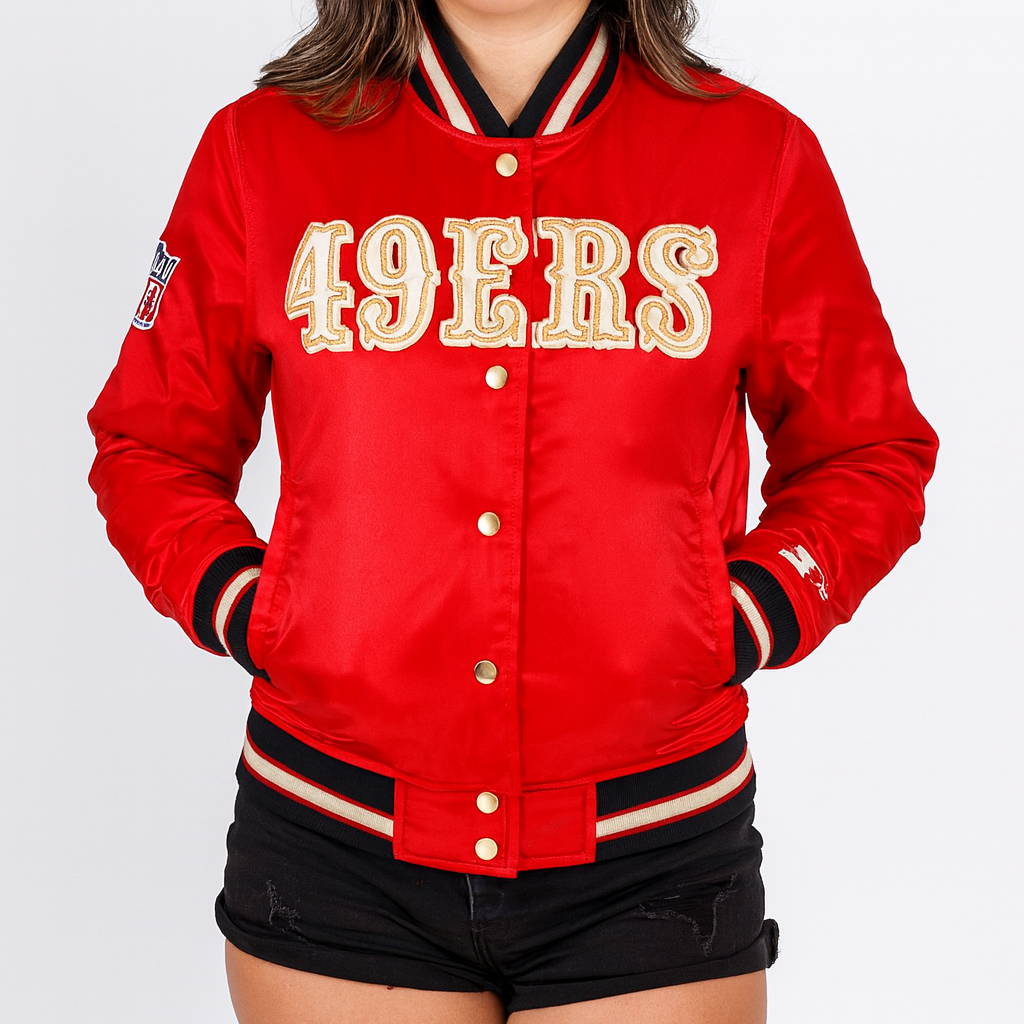 The Women’s San Francisco 49ers Starter Jacket made from satin. The jacket is available in a dazzling red color. The Women’s San Francisco 49ers Jacket has a rib knitted collar with a buttoned closure. The jacket has embroidered patches on the front, back and sleeves. The inner of the jacket consists of a soft viscose lining which provides warmth and comfort to the wearer. The sleeves of the jacket are long and fitting with rib knitted cuffs. To keep things, the Women’s San Francisco 49ers Starter Jacket has two side waist pockets which makes the jacket even more appealing. The fine quality stitching makes the jacket durable to wear. The Women’s San Francisco 49ers Jacket is suitable for casual wear especially in winter season.